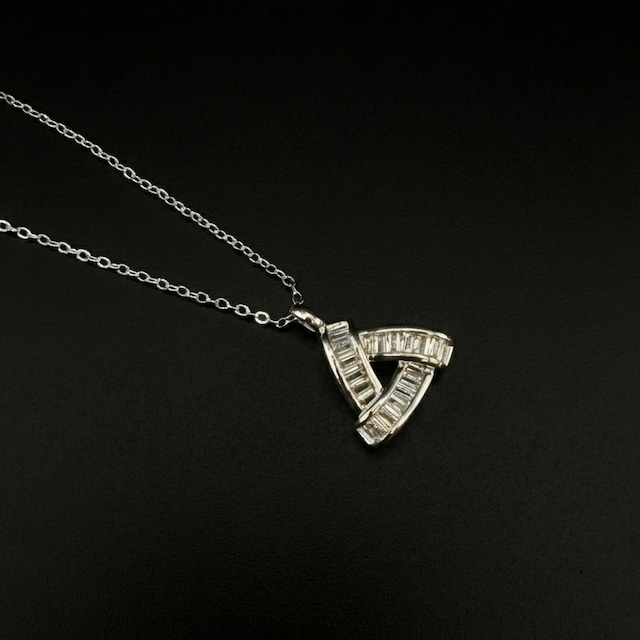 モダンな輝きを纏うトライアングルデザイン。 繊細なラインストーンが描く、洗練されたミニマルジュエリー。 立体的に交差するラインにクリアストーンを敷き詰めた、トライアングルモチーフのペンダント。 細やかにカットされたストーンが角度によってシャープに輝き、ミニマルでありながら存在感のあるデザインに仕上げています。 落ち着いたシルバートーンは、日常のコーディネートにも馴染みつつ、胸元にスタイリッシュな印象をプラス。単体使いはもちろん、短めのネックレスやチョーカーとの重ね付けでもモードな雰囲気を楽しめるアイテムです。 コレクション名:PREMIUM カラー:ゴールドトーン サージカルステンレスネックレスチェーン付属