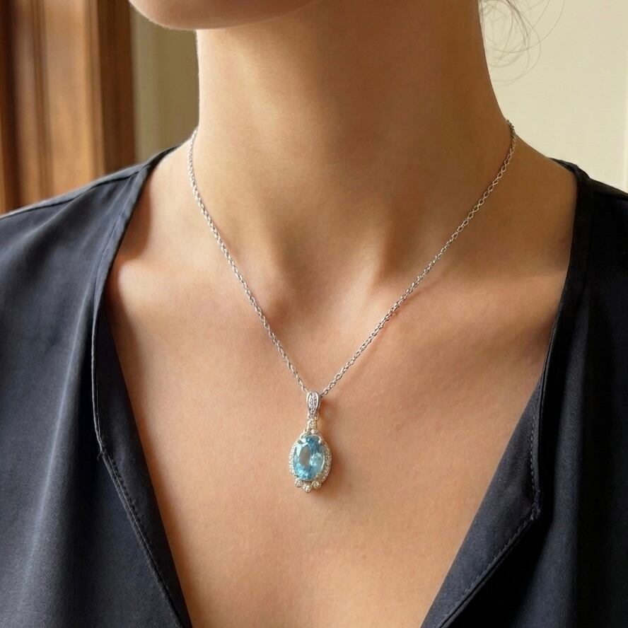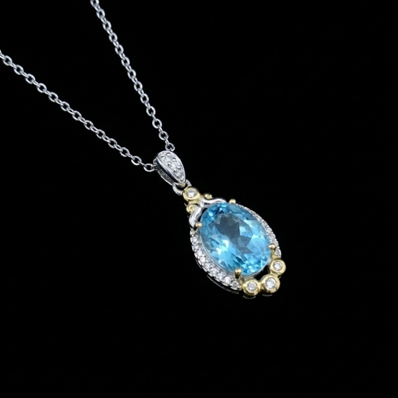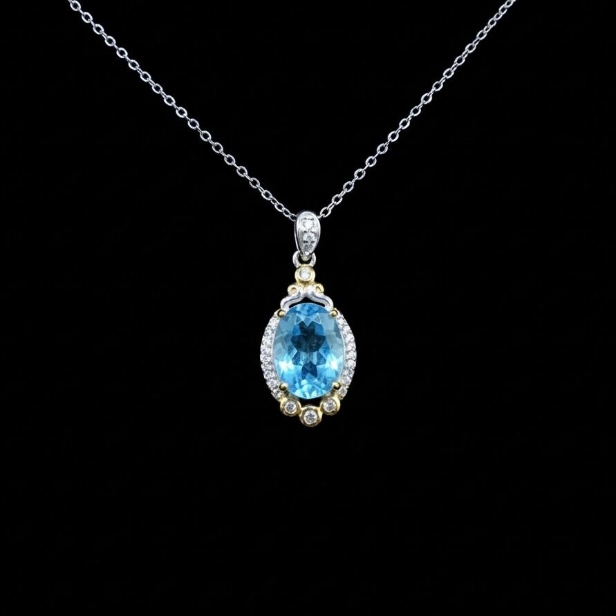 澄んだブルーのオーバルストーンを中心に、繊細な装飾をあしらったクラシックなスタイルのペンダント。
