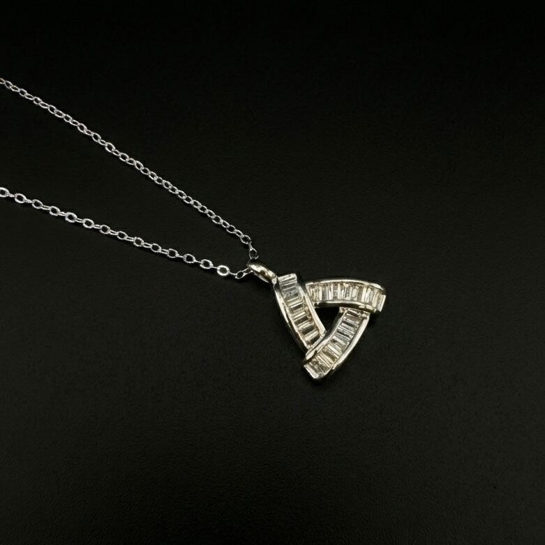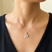 立体的に交差するラインにクリアストーンを敷き詰めた、トライアングルモチーフのペンダント。
