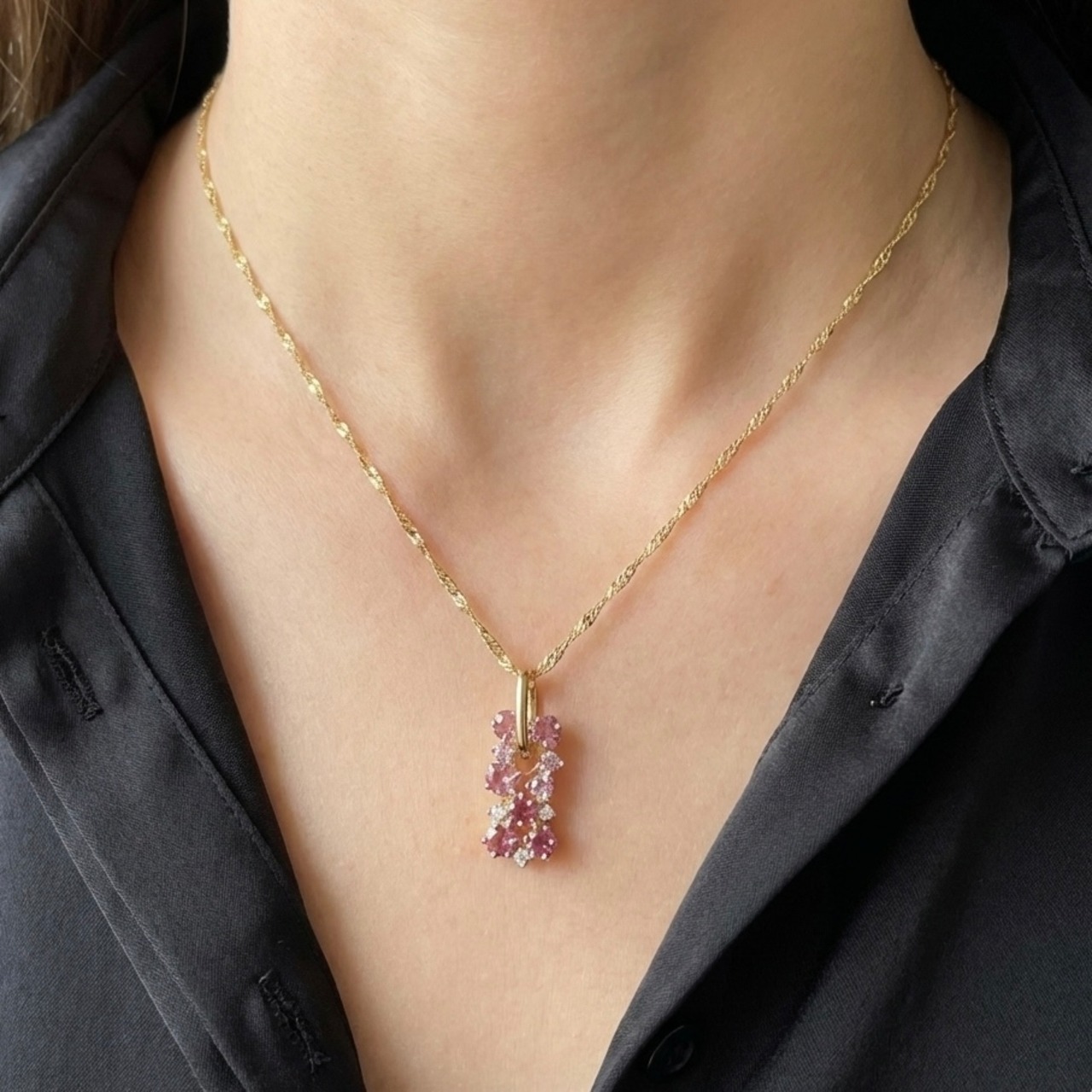 ストーンの立体感と、ゴールドトーンのメタルフレームが合わさることで、上品でフェミニンな印象に仕上げています。胸元に自然な彩りを添える色味で、日常使いにも特別な装いにも取り入れやすいデザインです。