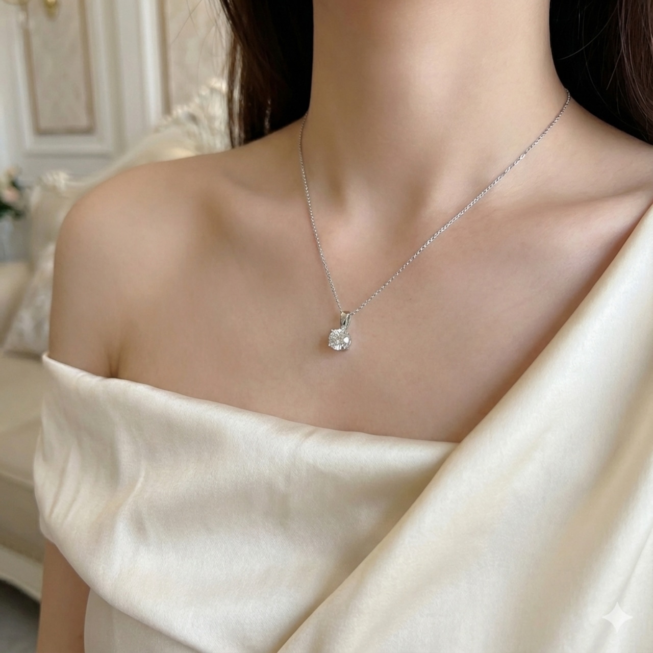 光を取り込む多面カットが立体感のある輝きを生み、胸元を上品で華やかな印象に仕上げます。