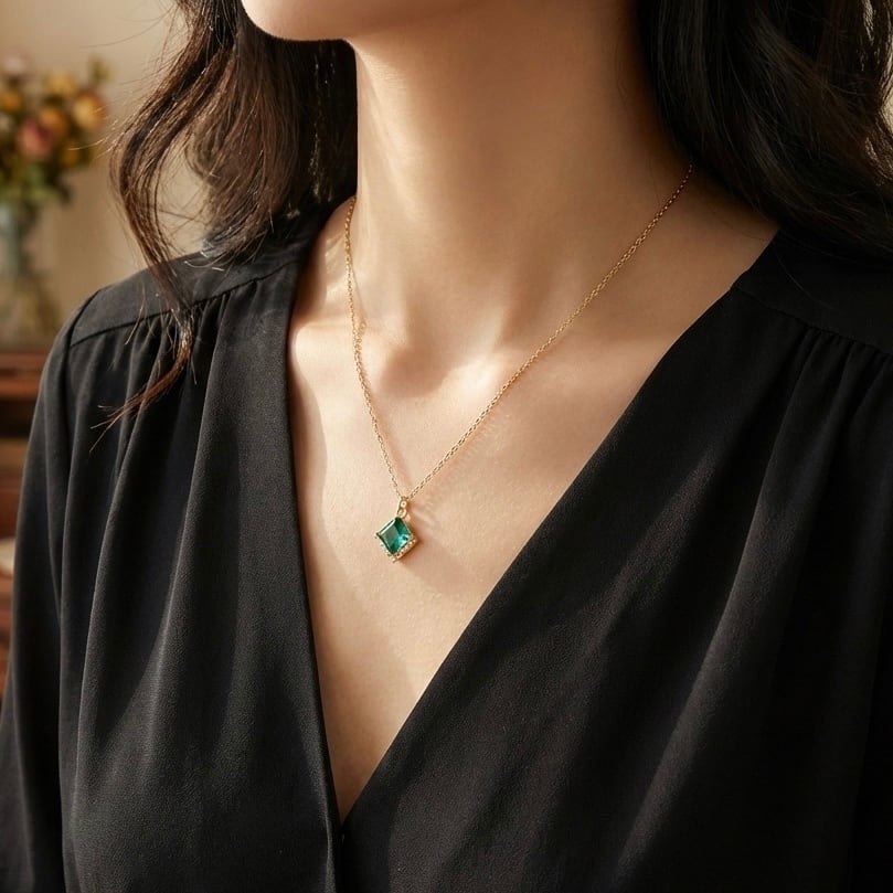 細身のチェーンと四角型トップの組み合わせは、首元をスマートに見せてくれるため、デイリーコーデからフォーマルなシーンまで幅広く活躍します。