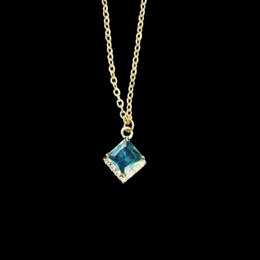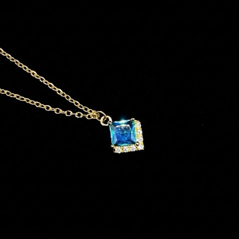 深いブルーが印象的なスクエアカットストーンを、ゴールドトーンのフレームで丁寧にセッティングしたネックレスです。ストーン周囲には小さなキュービックストーンをパヴェ状に配置し、華やかさと透明感をプラスしました。