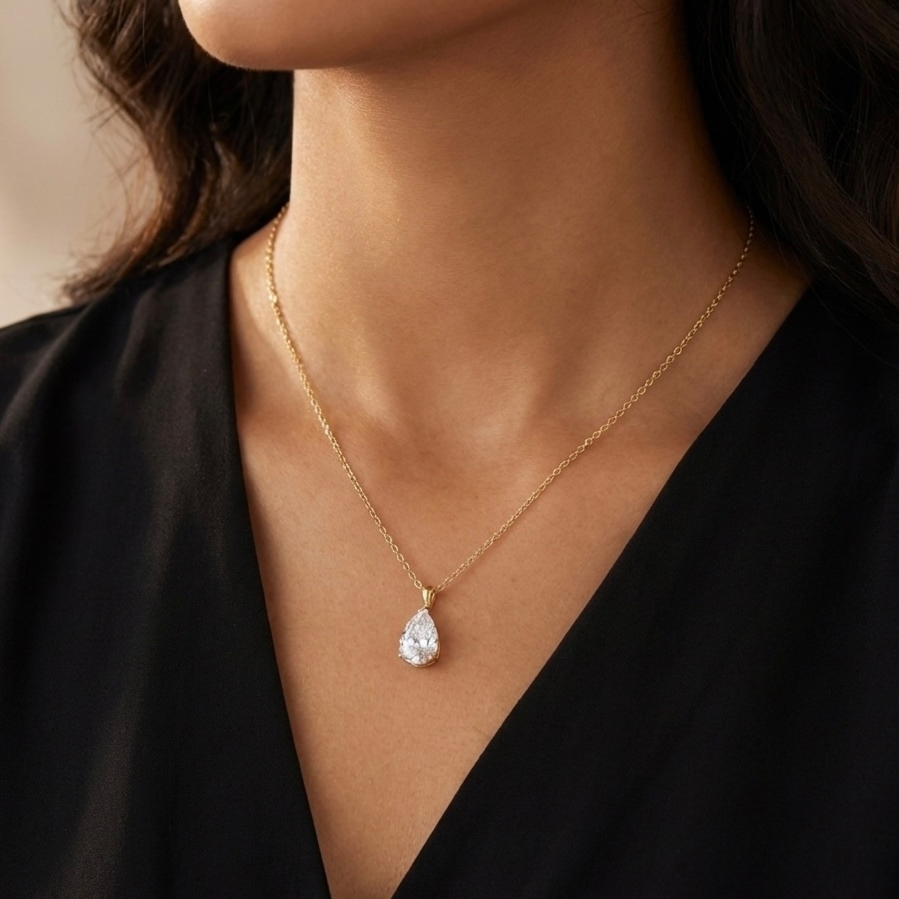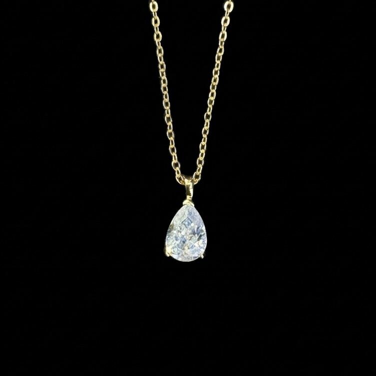 クリアストーンをしずく形にカットし、シンプルなゴールドフレームで包み込んだ上品なペンダント。