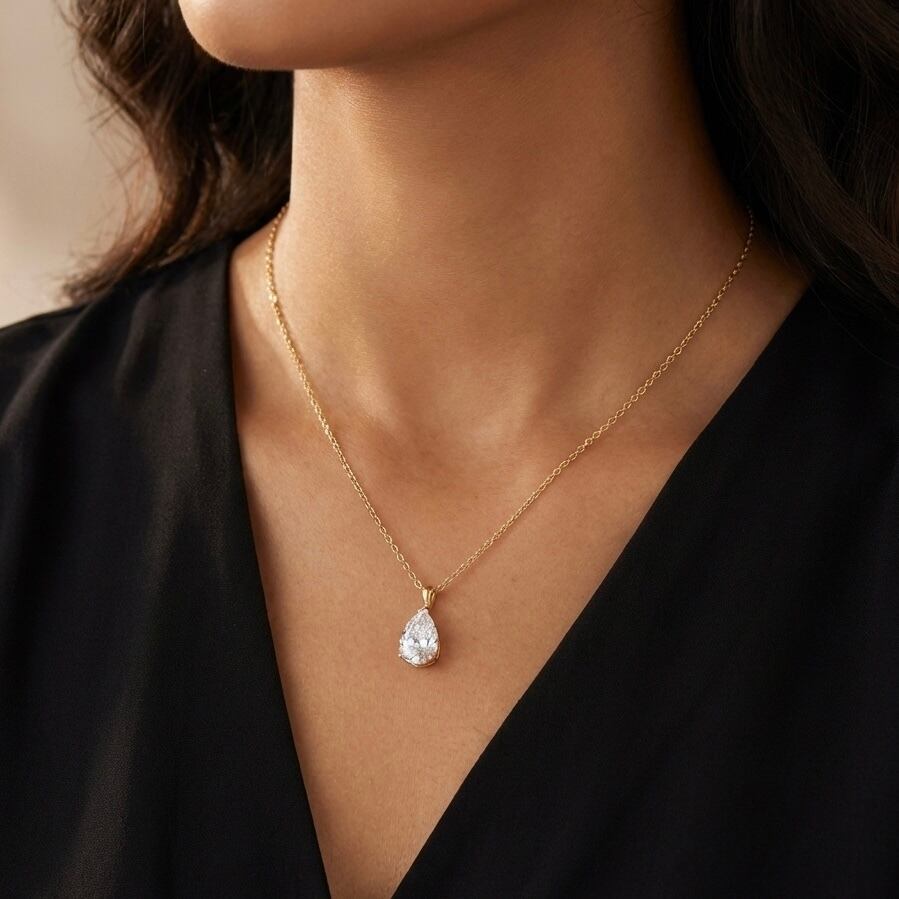 やわらかな曲線が特徴のドロップフォルムは、光を取り込むたびに透明感のある輝きを生み、胸元を華やかに演出します。